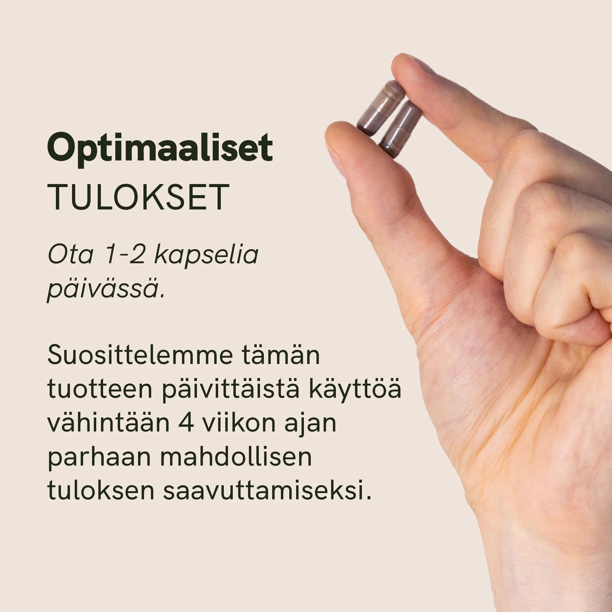 Ota 1–2 kapselia päivittäin lasillisella vettä, ellei lääkäri ole toisin määrännyt. Suositeltua päivittäistä annosta ei saa ylittää.