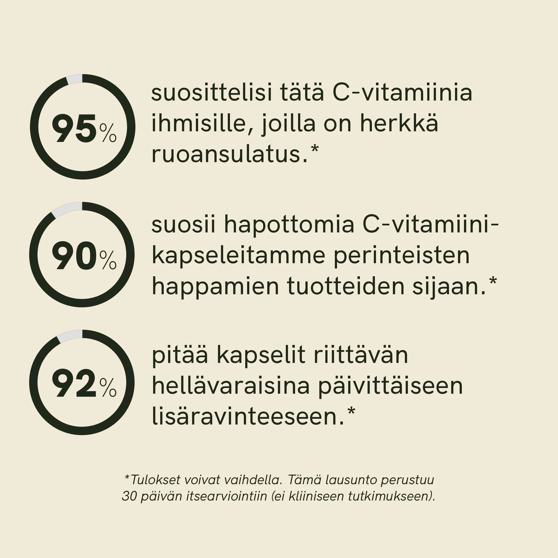 Kapseleissamme oleva kalsiumaskorbaatti on valmistettu synteettisesti tasaisen puhtauden ja laadun varmistamiseksi.