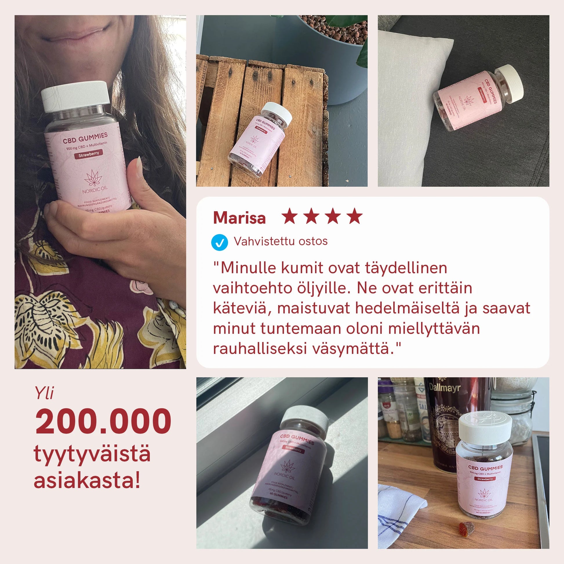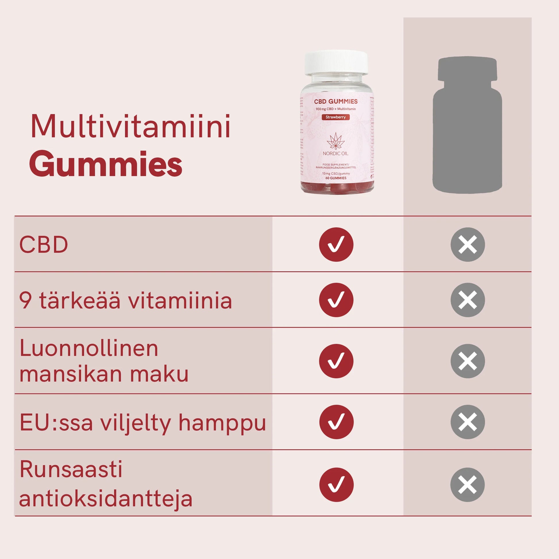 Herkulliset, kätevät ja ravinteikkaat: Nordic Oilin CBD Gummies yhdistävät korkealaatuisen hamppu-uutteen ja yhdeksän välttämätöntä vitamiinia. Jokainen karkki sisältää 15 mg CBD:tä, mikä vastaa noin 2,5 tippaa 15 % CBD-öljyä. Raikas mansikan maku yhdistettynä hienoiseen vitamiinin vivahteeseen tekee CBD Gummies -tuotteista miellyttävän tavan nauttia CBD:tä päivittäin.