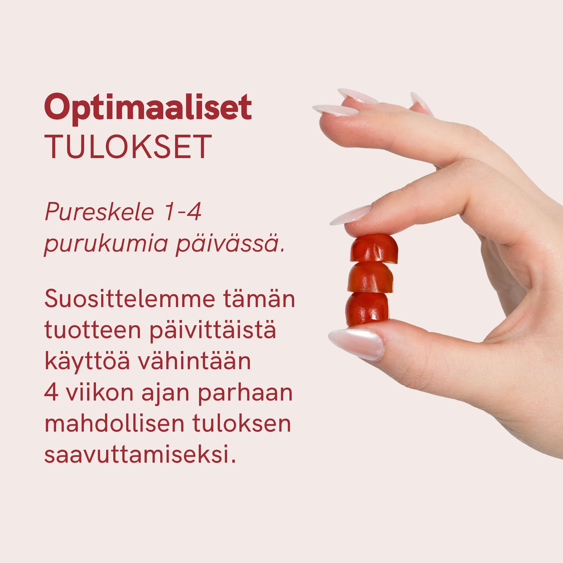 Nauti enintään 4 karkkia päivässä, ellei terveydenhuollon ammattilainen toisin kehota. 4 purukumin enimmäisvuorokausiannosta ei saa ylittää. 1 karkki sisältää 15 mg CBD:tä.