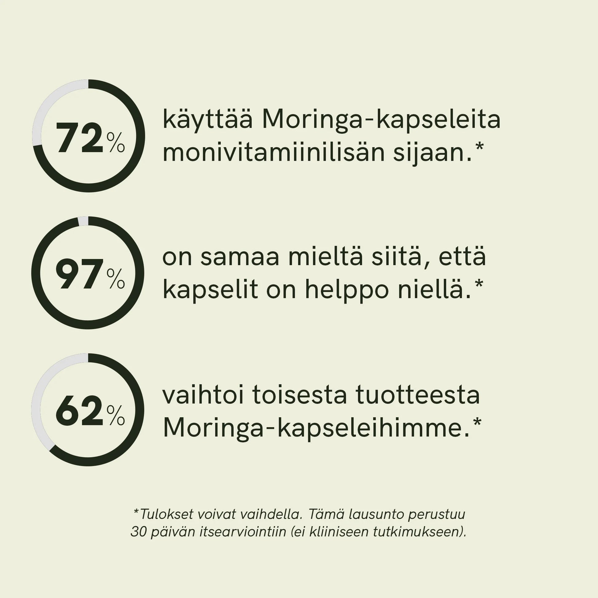 - Jokainen kapseli sisältää 400 mg luomumoringajauhetta