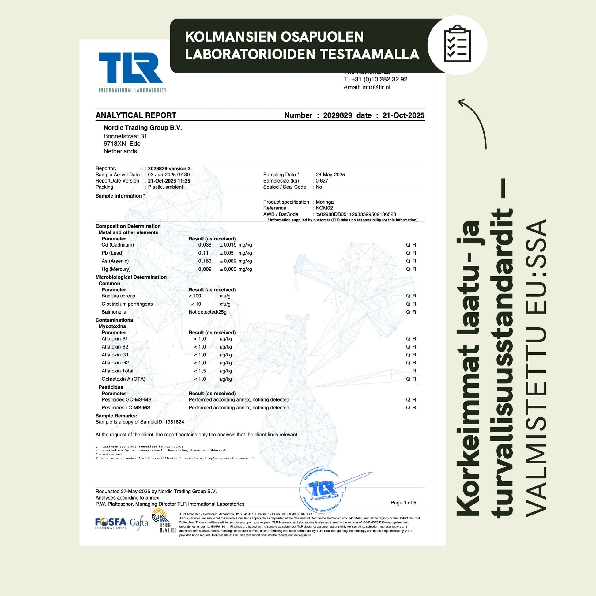 Valmistettu EU:ssa, meidän Moringa-kapselimme ovat vegaanisia, gluteenittomia ja ilman säilöntäaineita, keinotekoisia makuja tai värejä. Laboratoriotestatut kapselit ovat täydellinen valinta, jos etsit puhdasta, kasviperäistä ravintolisää parantamaan hyvinvointiasi.