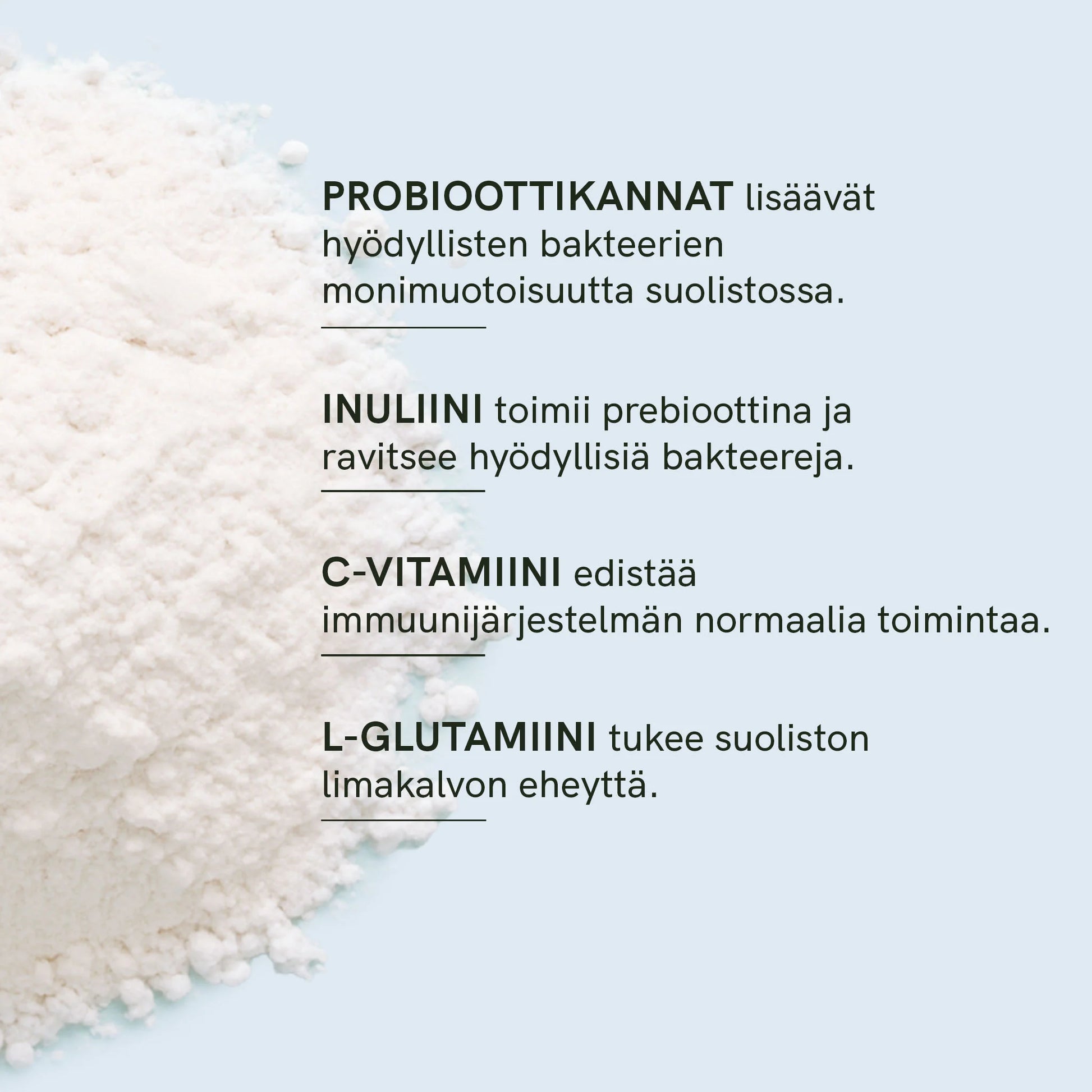 - 10 hyödyllistä bakteerikantaa + C-vitamiinia immuunijärjestelmän tueksi