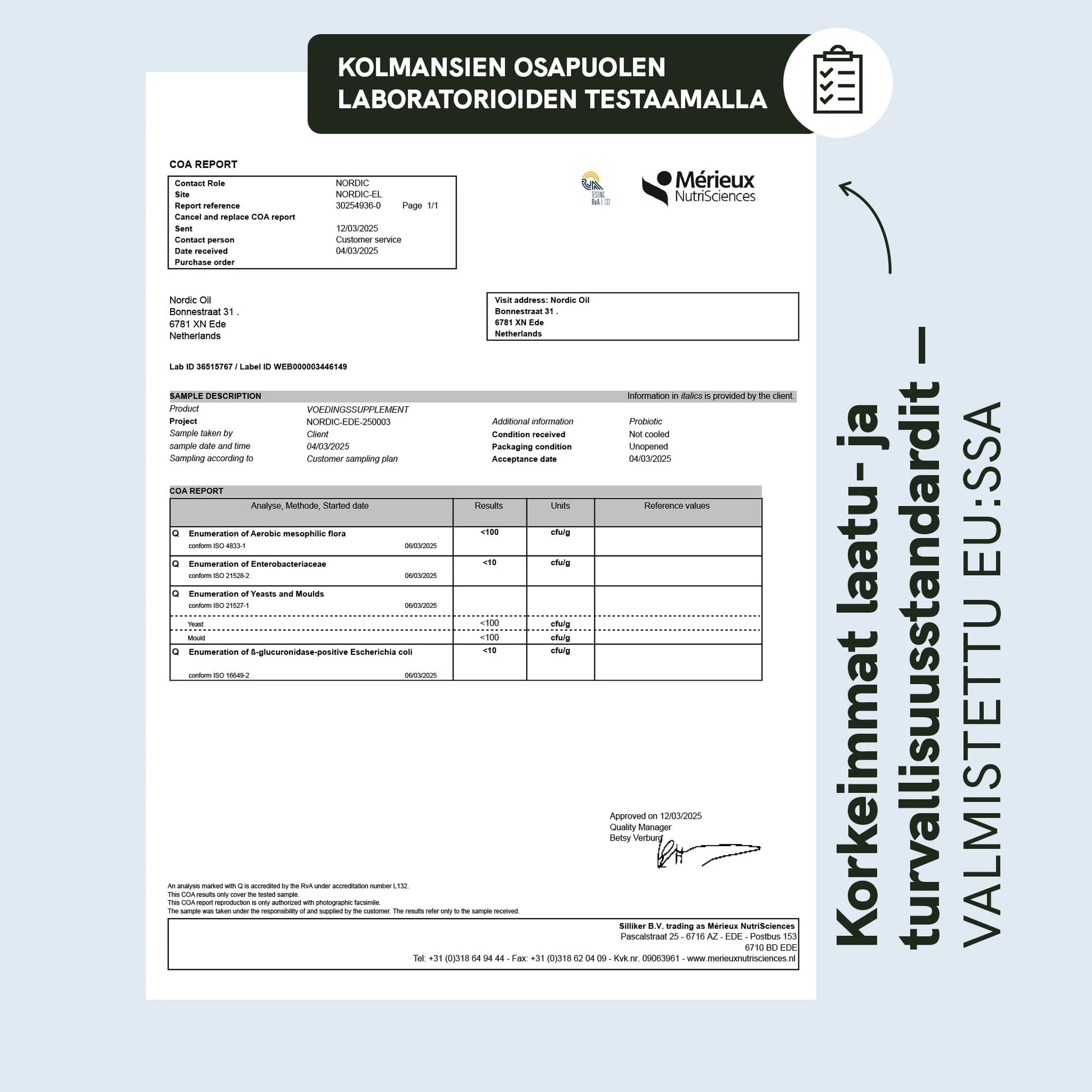 - 60 probioottikapselia, joissa jokaisessa 25 miljardia CFU:ta