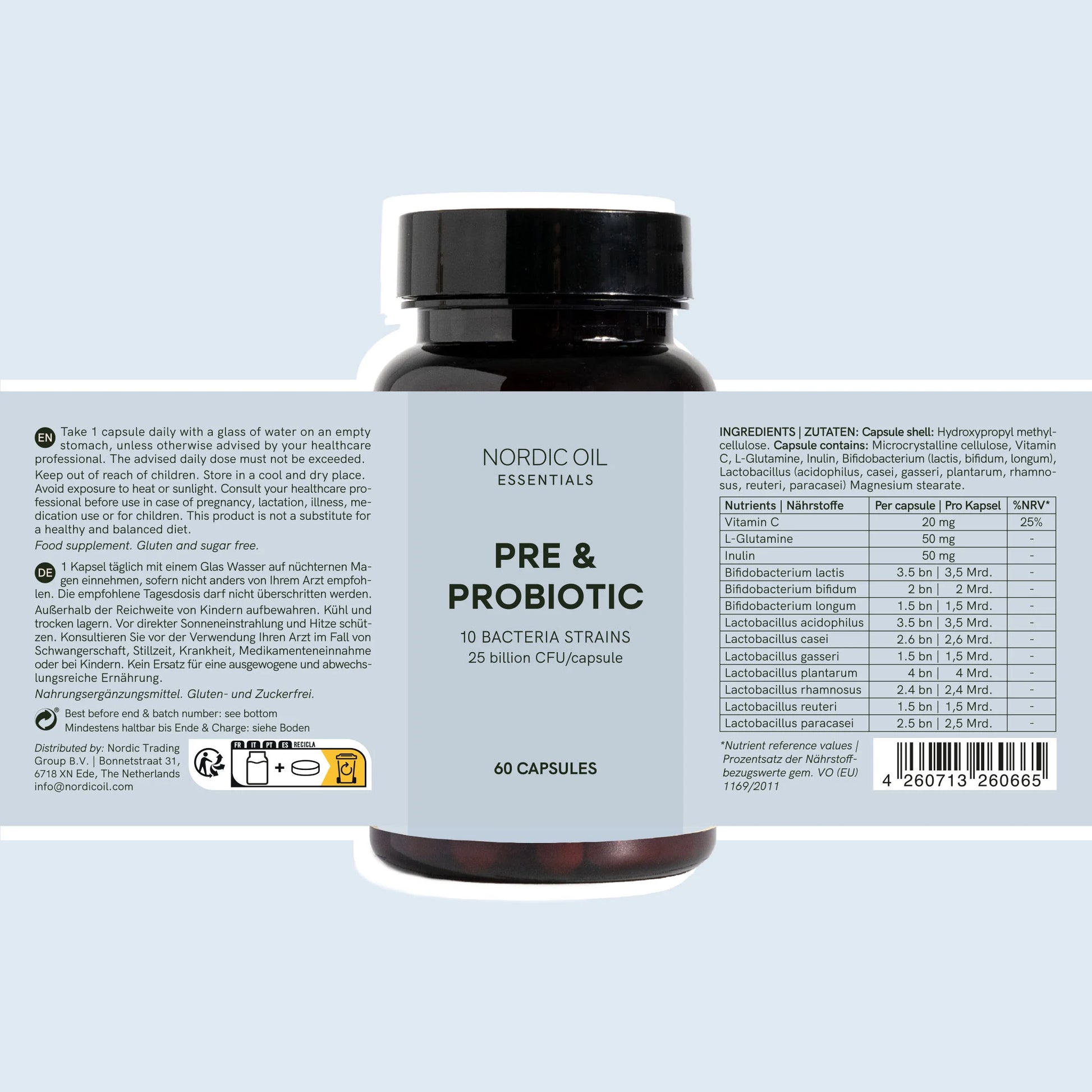 Nordic Oil Essentials Probiootit on ensiluokkainen suolistoflooralisä, joka on suunniteltu edistämään suoliston optimaalista terveyttä. Kukin pullo sisältää 60 kapselia, mikä tarjoaa kahden kuukauden annoksen. Tämä koostumus sisältää 25 miljardia CFU:ta kapselia kohti ja 10 erilaista hyödyllistä bakteerikantaa, joten se takaa vankan bakteerispektrin tasapainoisen ruoansulatuksen varmistamiseksi. C-vitamiinilla, L-glutamiinilla ja inuliinilla rikastetut probiootit tarjoavat lisää immuunijärjestelmän tukea, suolistoesteen ylläpitoa ja prebioottista ravintoa.Tämä tuote ei sisällä keinotekoisia maku- ja väriaineita eikä CBD:tä.